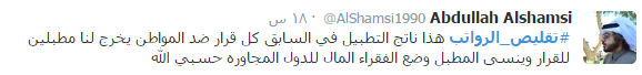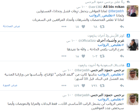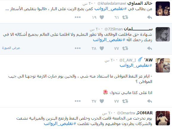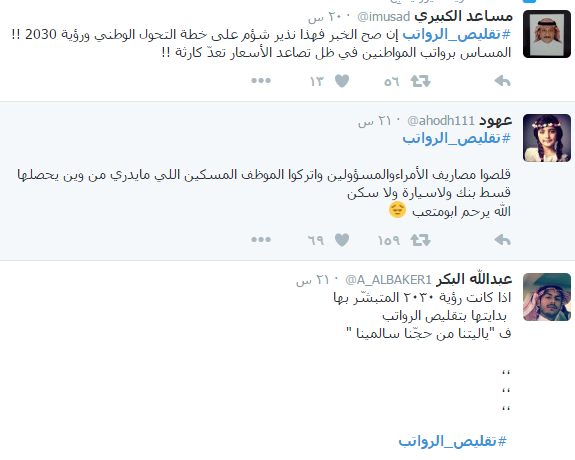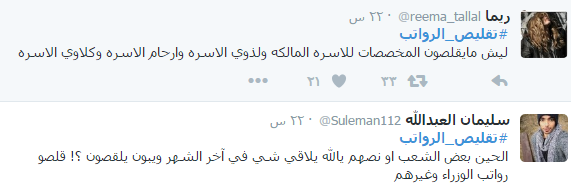 وأكد بعض المغردون على مطالبتهم المستمرة بزيادة الراتب منذ سنوات بلا مجيب، والطريف في الأمر أن هشتاج تقليص الراتب جاء من فهم خاطئ لبرنامج التحول الوطني ٢٠٢٠، الذي أعلنته الحكومة السعودية وتطمح فيه لتقليص الإنفاق على الرواتب بتحميل ٤٠٪ منها للقطاع الخاص .