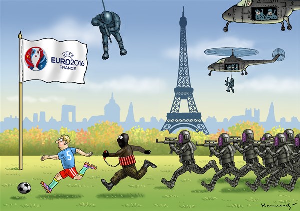 واهتم موقع كاجل للرسوم الساخرة بانطلاق “يورو 2016” غدًا في فرنسا، مع تهديدات بهجوم لتنظيم الدولة خلاله، واستعدادات أمنية له