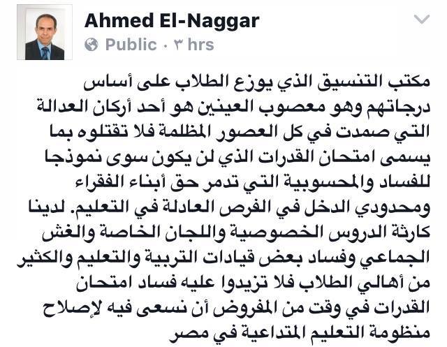 وقال النجار في تدوينة عبر صفحته الشخصية بموقع التواصل الاجتماعي “فيس بوك”: “مكتب التنسيق الذي يوزع الطلاب على أساس درجاتهم وهو معصوب العينين، هو أحد أركان العدالة التي صمدت في كل العصور المظلمة، فلا تقتلوه بما يسمى امتحان القدرات الذي لن يكون سوى نموذجًا للفساد والمحسوبية التي تدمر حق أبناء الفقراء ومحدودي الدخل في الفرص العادلة في التعليم“.