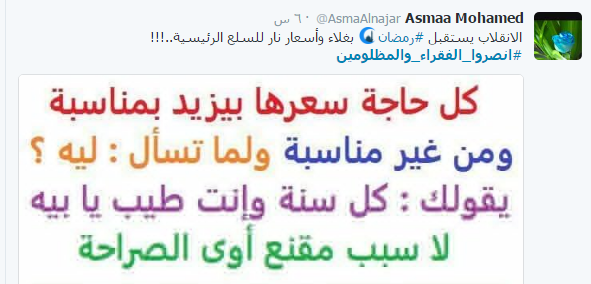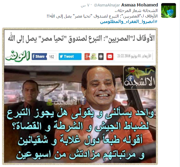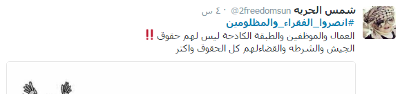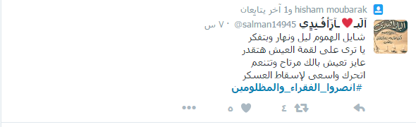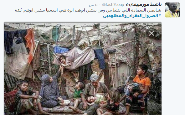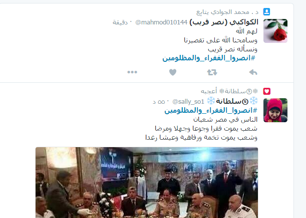 دخل هاشتاج تحت اسم “انصروا الفقراء والمظلومين” ضمن قائمة الأكثر تداولا بين الهاشتاجات على موقع التدوين المصغر”تويتر” بالتزامن مع استجابة الآلآف من المواطنين لدعوة “التحالف الوطني لدعم الشرعية ورفض الانقلاب” إلى أسبوع ثوري جديد بعنوان “انصروا الفقراء والمظلومين”؛ للتنديد بما يعانيه الشعب المصري من أزمات معيشية واقتصادية على يد عصابة العسكر.