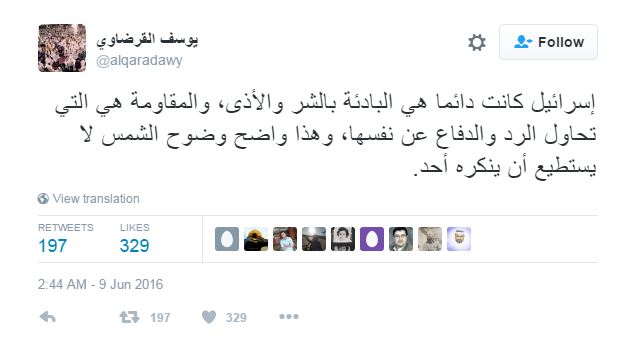 غرد الدكتور يوسف القرضاوي عبر حسابه على موقع ” تويتر” عقب قتل 4 إسرائيليين و إصابة 16 آخرين في عملية تل أبيب التي نفذها أثنان من الفلسطينيين، أول أمس، الأربعاء، قائلاً: ” إسرائيل كانت دائما، هي البادئة بالشر والأذى، والمقاومة هي التي تحاول الرد والدفاع، وهذا وضح وضوح الشمس لا يستطيع أحد أن ينكره”.