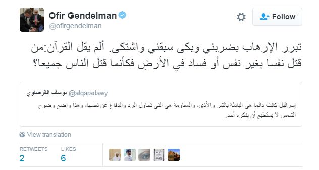 وتسببت التغريدة في غضب المتحدث باسم الحكومة الإسرائيلية، الأمر الذي دعاه للرد على ” القرضاوي” بتغريدة أخرى استدل فيها بأية قرآنية قائلا : “تبرر الإرهاب بضربنى وبكى سبقنى واشتكى، ألم يقل القرآن: من قتل نفسا بغير نفس أو فساد فى الأرضِ فكأنما قتل الناس جميعا؟”.