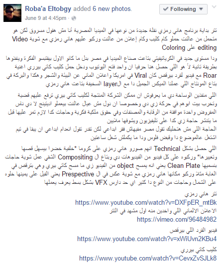 وأنهى المنشور بقوله: “اللي حصل بشكل Technical انهم صورو هاني رمزي على كروما *خلفية خضرا بيسهل قصها وتغييرها* وركبوه على كل فيديو من الفيديوهات دي وبتاع ال Compositing الشقي عمل شوية حاجات بنسميها Clean Plate يعني انه يمسح object من الفيديو زي ما مسح كاتي بيري وهي بترقص في الغابة مثلا وركبو مكانها هاني رمزي مع شوية عكس في ال Prespective يعني الفيل على يمينها خلوه على الشمال وحاجات من النوع دا كتير اي حد دارس VFX بشكل بسط يعرف يعملها”.