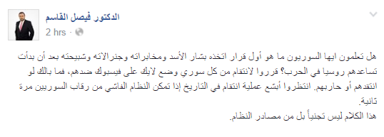 وقال القاسم في منشور له عبر حسابه على موقع “فيس بوك”: “هل تعلمون أيها السوريون ما هو أول قرار اتخذه بشار الأسد ومخابراته وجنرالاته وشبيحته بعد أن بدأت تساعدهم روسيا في الحرب؟ قرروا الانتقام من كل سوري وضع لايك على فيسبوك ضدهم، فما بالك لو انتقدهم أو حاربهم”.