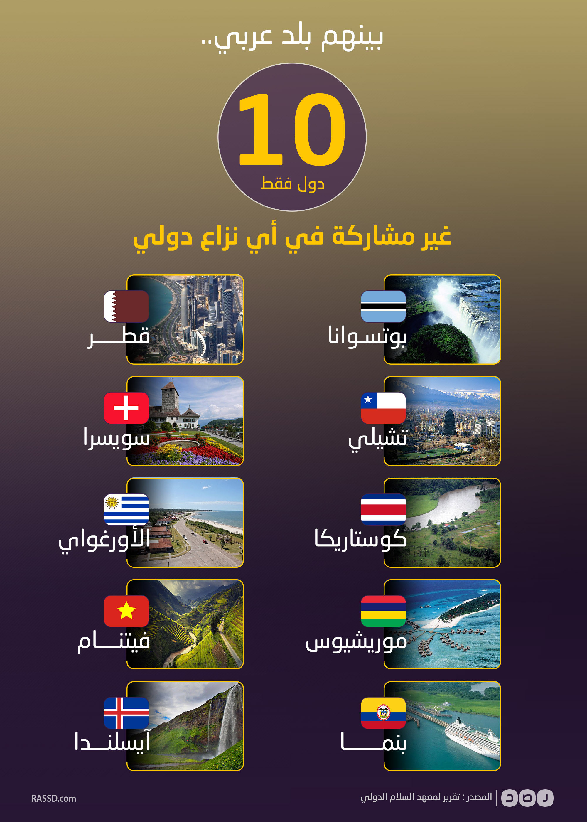 والدول العشر الخالية من الصراع، حسب مؤشر السلام العالمى، هى بوتسوانا وشيلى وكوستاريكا واليابان وموريشيوس وبنما وقطر وسويسرا وأوروجواى وفيتنام.