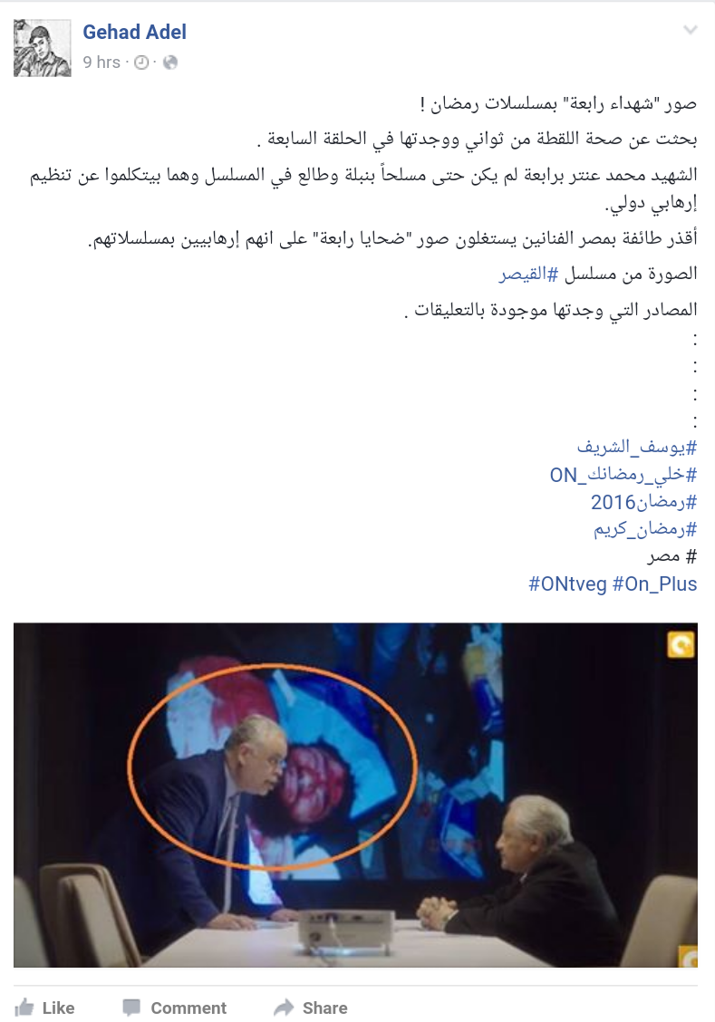 يقول جهاد عادل: بحثت عن صحة اللقطة ووجدتها في الحلقة السابعة.. الشهيد محمد عنتر برابعة لم يكن حتى مسلحًا بنبلة وطالع في المسلسل وهما بيتكلموا عن تنظيم إرهابي دولي.