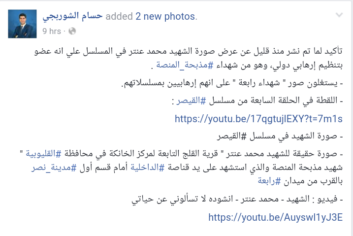 وأكد الإعلامي حسام الشوربجي أن هذه صورة حقيقية للشهيد محمد عنتر من “قرية القلج التابعة لمركز الخانكة في محافظة #القليوبية ” شهيد مذبحة المنصة والذي استشهد على يد قناصة #الداخلية أمام قسم أول #مدينة_نصر بالقرب من ميدان #رابعة.