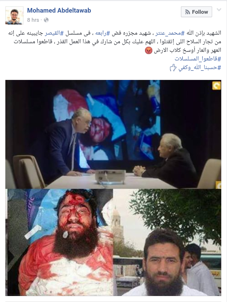 أثارت هذه الصورة موجه من الغضب بين النشطاء على مواقع التواصل الاجتماعي، حيث دشن نشطاء حملة لمقاطعة المسلسل ونشروا صورة القتيل على مواقع التواصل الاجتماعي، ودشنوا هاشتاج #محمد_عنتر لإظهار الحقيقة.