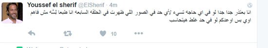قدم الفنان يوسف الشريف، اعتذارًا لجمهوره عبر حسابه الخاص على موقع التواصل الاجتماعي ” تويتر ” عن بعض اللقطات التى ظهرت أمس بالحلقة السابعة لمسلسله “القيصر”، والتي قوبلت بموجة غضب عارمة من الجمهور ومستخدمي مواقع التواصل الاجتماعي.