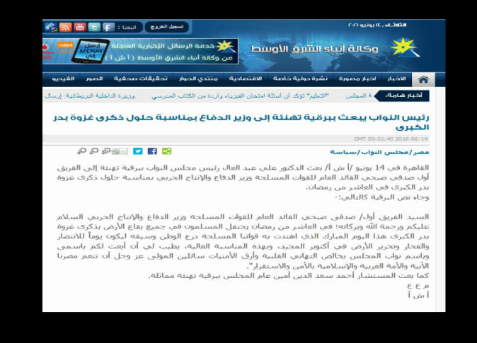 “فخامة السيد الرئيس/ عبد الفتاح السيسي رئيس الجمهورية السلام عليكم ورحمة الله وبركاته، يطيب لي أن أبعث لفخامتكم باسمي وباسم نواب المجلس بخالص التهنئة القلبية بمناسبة حلول ذكرى غزوة بدر الكبرى، في العاشر من رمضان المبارك، تلك الذكرى التي سجلها التاريخ الإسلامي في صفحاته الخالدة, واتخذها جيشنا قدوة لنصره في حرب أكتوبر المجيدة، سائلين المولى عز وجل أن تنعم مصرنا الحبيبة والأمة العربية والإسلامية بالأمن والاستقرار، وفقكم الله وسدد على طريق الحق والنصر خطاكم“.