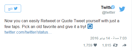 أعلنت شبكة التدوينات المصغرة على ” تويتر “إطلاقها ميزة جديدة تُتيح من خلالها للمُستخدمين إمكانية قيامهم بإعادة مُشاركة تغريداتهم أو الاقتباس من تغريدة قاموا بنشرها سابقًا.
