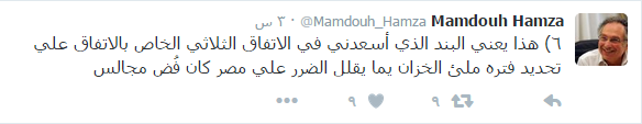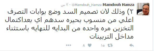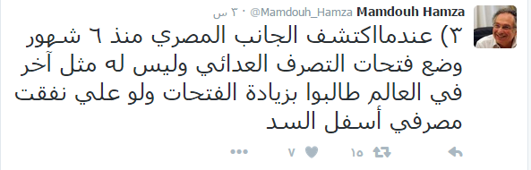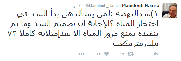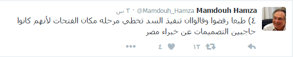 وقال حمزة في سلسلة تغريدات على صفحته بموقع “تويتر”: إنه عندما اكتشف الجانب المصري منذ ٦ أشهر وضع فتحات التصرف، طالب بزيادة الفتحات ولو على نفقة مصر فى أسفل السد، لكن الرد الإثيوبي كان الرفض؛ حيث إن تنفيذ السد تخطى مرحلة مكان الفتحات لأنهم كانوا حاجبين التصميمات عن خبراء مصر”.