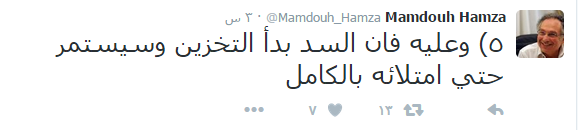 أكد الناشط السياسي المهندس ممدوح حمزة: أن إثيوبيا بدأت في مرحلة تخزين المياه بسد النهضة، موضحًا أن تصميم السد وما تم تنفيذه يمنع مرور المياه إلا بعد امتلائه كاملا بـ ٧٢ مليار متر مكعب، حيث إن تصميم السد وضع بوابات التصرف أعلى من منسوب البحيرة.