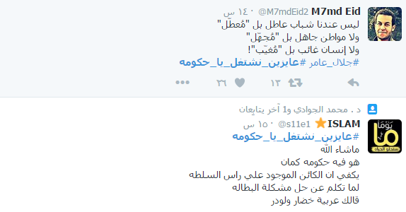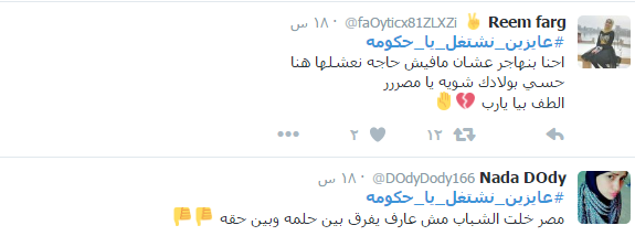 وطالب نشطاء موقع التواصل الاجتماعي “تويتر”، الحكومة المصرية بتشغيلهم طبق شهادات تخرجهم الجامعية، عبر هاشتاج عايزين نشتغل يا حكومة على موقع “تويتر”ومؤكين أن الحكومة مشغولة في بناء السجون للشعب.
