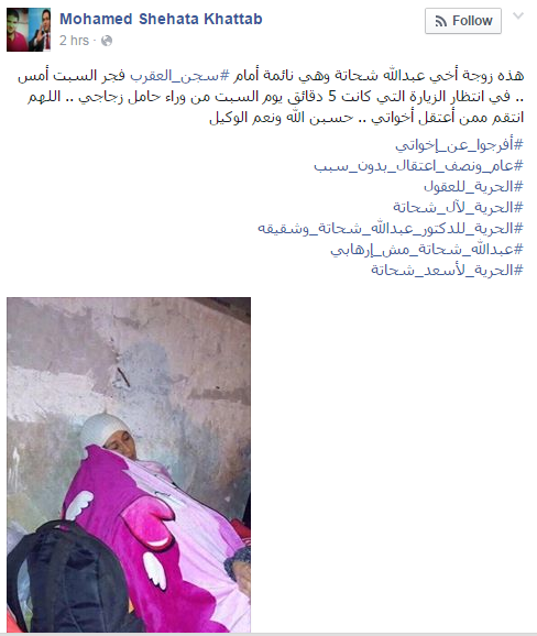 وكان الصحفي محمد شحاتة، شقيق المعتقل الدكتور عبدالله شحاتة قد نشر صورة زوجة شقيقه عبر حسابه الشخصي بفيس بوك، وعلق عليها قائلا: “هذه زوجة أخي عبدالله شحاتة وهي نائمة أمام سجن العقرب.. في انتظار الزيارة التي كانت 5 دقائق يوم السبت من وراء حامل زجاجي.. اللهم انتقم ممن اعتقل إخوتي.. حسبن الله ونعم الوكيل”.
