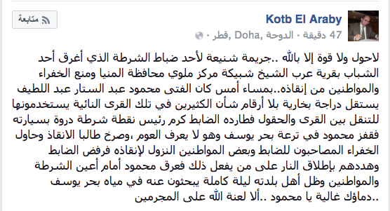 وقال العربي خلال منشور له على صفحته الشخصية على موقع التواصل الاجتماعي “فيس بوك”: “إن الشاب محمود عبد الستار عبد اللطيف كان يستقل دراجة بخارية بلا أرقام شأن الكثيرين في تلك القرى النائية يستخدمونها للتنقل بين القرى والحقول، فطارده الضابط “كرم” رئيس نقطة شرطة دروة بسيارته فقفز محمود في ترعة بحر يوسف وهو لا يعرف العوم، وصرخ طالبًا الإنقاذ وحاول الخفراء المصاحبون للضابط وبعض المواطنين النزول ﻹنقاذه فرفض الضابط وهددهم بإطلاق النار على من يفعل ذلك، فغرق محمود أمام أعين الشرطة والمواطنين”.