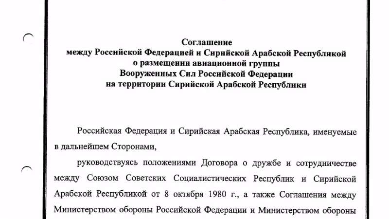 وفي البند الثالث من المادة السادسة جاء أيضًا أن الأعيان المنقولة وغير المنقولة التابعة لمجموعة الطيران الروسية تبقى مصونة بموجب هذا الاتفاق، ولا يحق لممثلي الجمهورية العربية السورية الدخول إلى مكان نشر القوات الروسية بدون اتفاق مسبق.