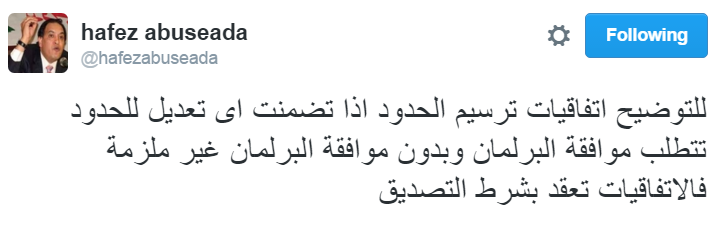 وبعد يوم واحد من الإعلان، صدر بيان من مجلس الوزراء، يفيد بتوقيع اتفاقية ترسيم الحدود البحرية مع السعودية ووقوع جزيرتي تيران وصنافير الموجودتين في البحر الأحمر في المياه الإقليمية للمملكة.