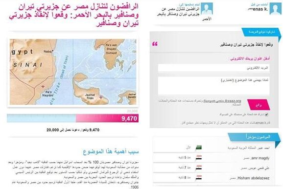 ودعت مجموعة من النشطاء المواطنين للمشاركة في حملة توقيعات شعبية؛ لرفض التنازل عن جزيرتي تيران وصنافير للمملكة العربية السعودية، تحت اسم “الرافضون لتنازل مصر عن جزيرتي تيران وصنافير بالبحر الأحمر.. وقعوا لإنقاذ الجزيرتين”.