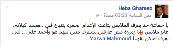 “هبة غريب”، خطيبة المعتقل “أحمد علي”، نشرت على صفحتها على موقع “فيس بوك” تسأل أصدقائها عن أماكن بيع الملابس الحمراء، أو ملابس الإعدام، حيث تقوم إدارة السجن بتسليم بدلة واحدة لكل معتقل محكوم عليه بالإعدام.