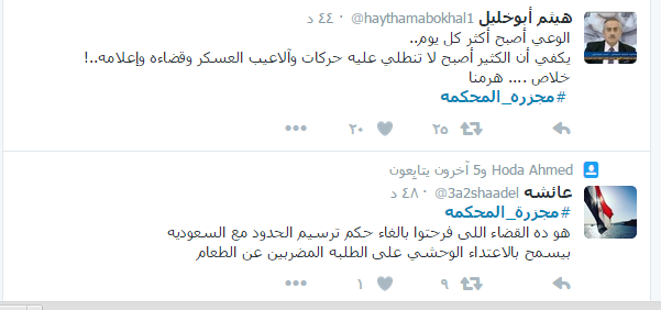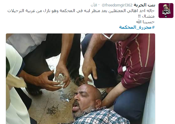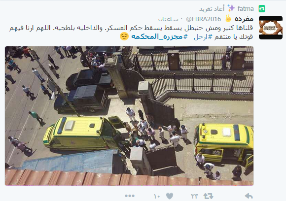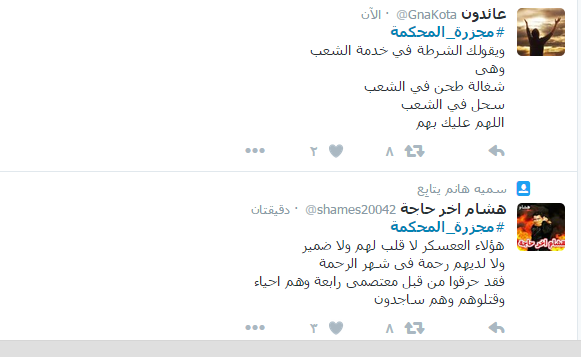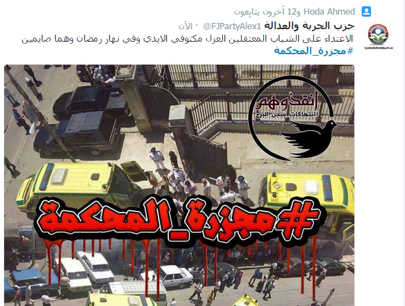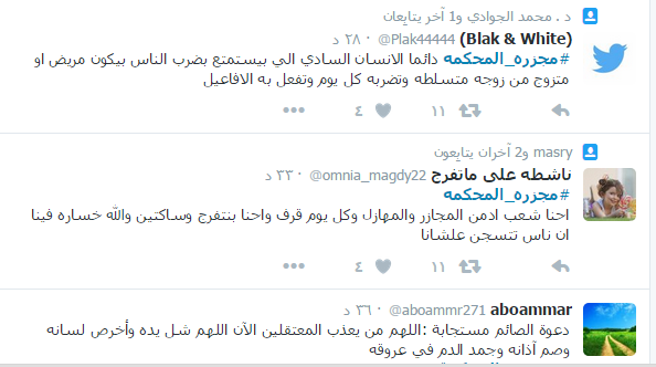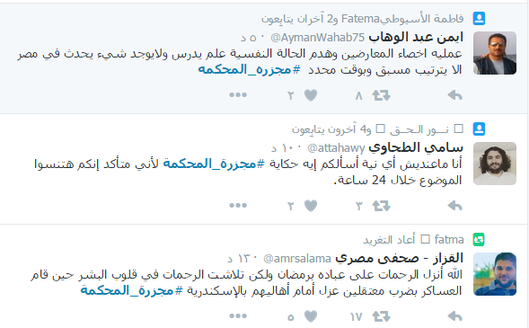 دشن مغردو موقع التدوين العالمي “تويتر” هاشتاج “مجزرة المحكمة”، أعربوا من خلاله عن غضبهم من اعتداء قوات الأمن على الطلاب المضربين عن الطعام داخل المحكمة البحرية بميدان المنشية وسط الإسكندرية، ما أدى إلى وقوع ٩ إصابات خطيرة، تم نقلهم جميعًا إلى المستشفى الميري وسط استغاثات متعددة من أهالي الطلاب المعتقلين.