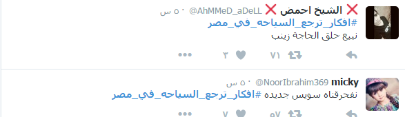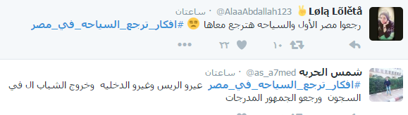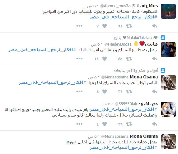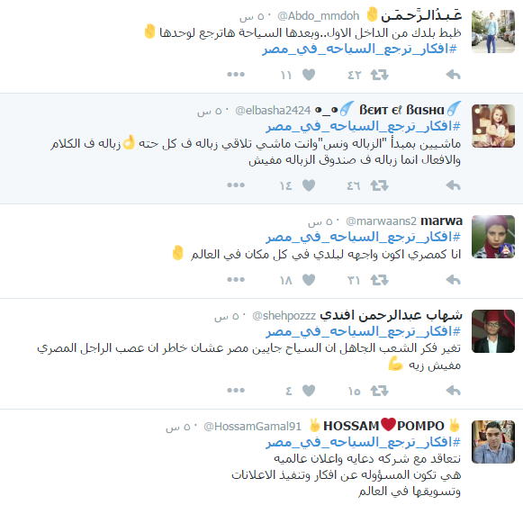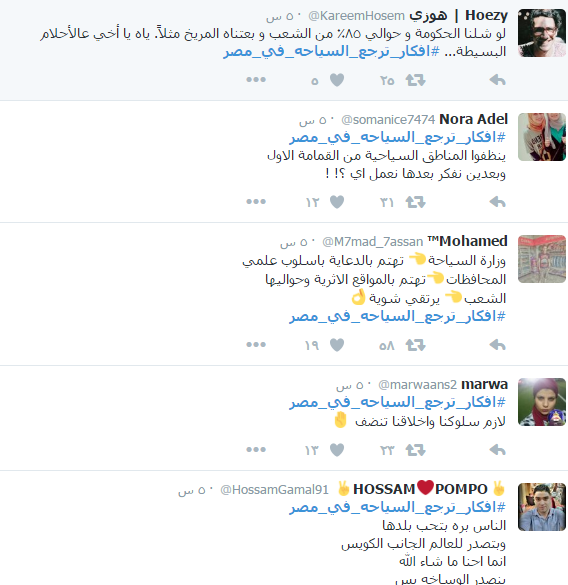 وطرح فريق من المغردين أفكار لدعم وتنشيط السياحة، منها الترويج للمناطق السياحية المصرية عبر المواقع الأجنبيه، والتعاقد مع شركه دعايا وإعلان عالمية للتسويق للأماكن السياحية المصرية.