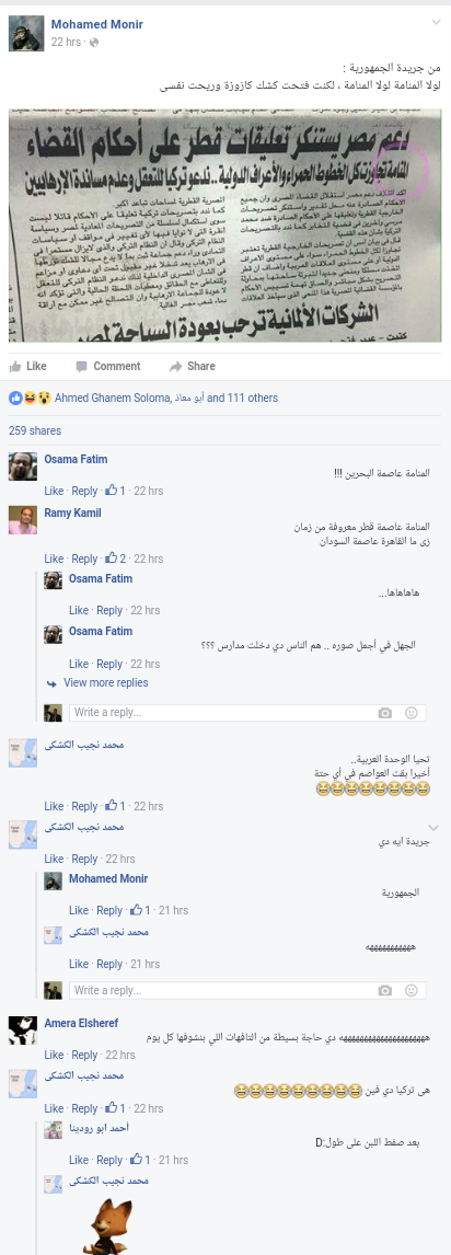 تداول نشطاء على مواقع التواصل الاجتماعي “فيسبوك”، صورة لجريدة الجمهورية عدد أول أمس؛ حيث تنشر الجريدة رد الخارجية المصرية على التصريحات القطرية، بشأن حكم المحكمة على الدكتور محمد مرسي في قضية التخابر مع دولة قطر.