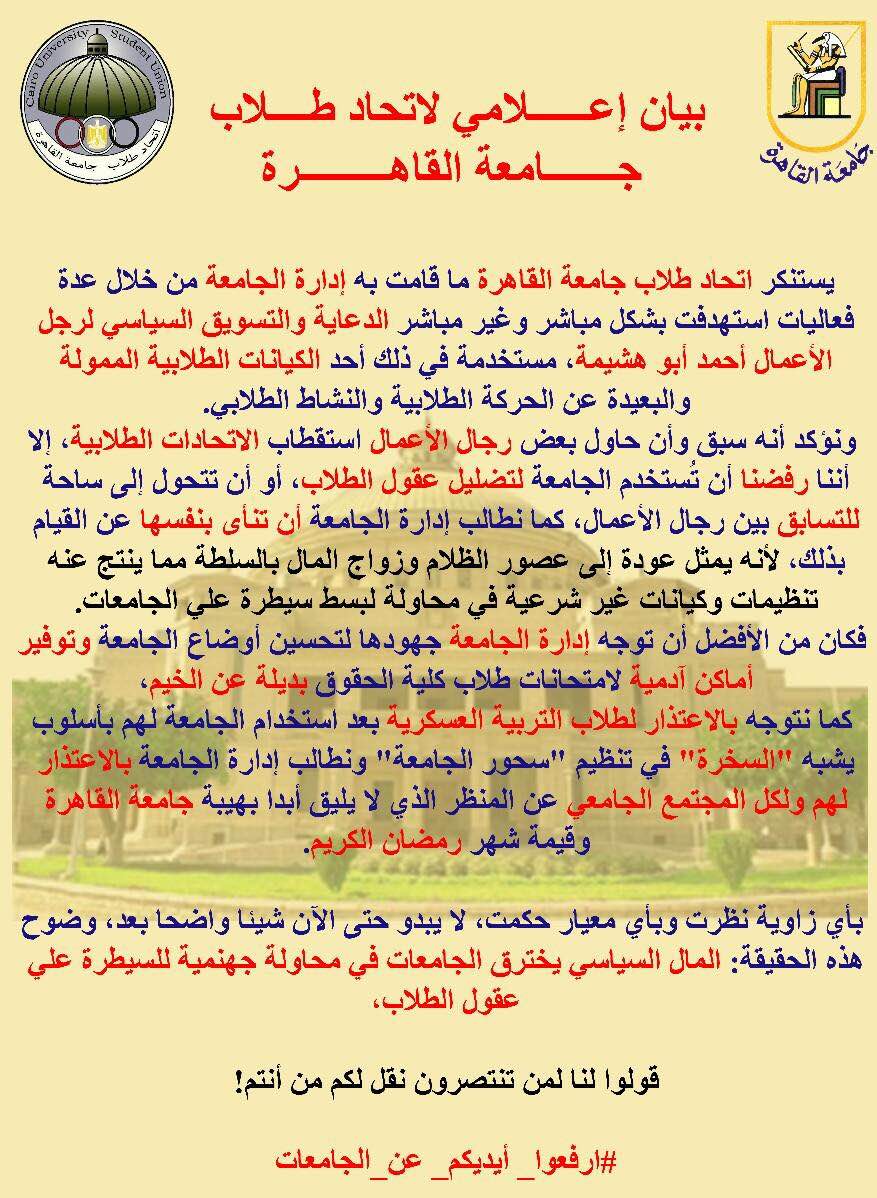 وجاء ذلك خلال بيان نشره عبر صفحته على موقع التواصل الاجتماعي “فيس بوك” ذكر خلاله : “يستنكر اتحاد طلاب جامعة القاهرة ما تنظمه إدارة الجامعة من فعاليات استهدفت بشكل مباشر أو غير مباشر الدعاية والتسويق السياسي لأحد رجال الأعمال مستخدمة في ذلك أحد الكيانات الطلابية الممولة والبعيدة عن الحركة الطلابية والنشاط الطلابي، وقد سبق وأن حاول رجال الأعمال استقطاب الاتحادات الطلابية إلا أننا رفضنا أن تستخدم الجامعة لتضليل عقول الطلاب، وأن تتحول إلى ساحه للتسابق بين رجال الأعمال”.