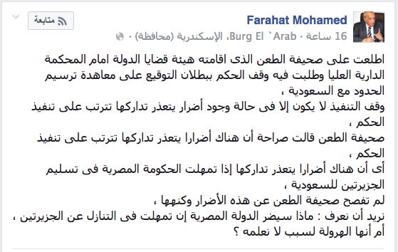 وأضاف “فرحات” خلال منشور له عبر صفحته الشخصية على موقع التواصل الاجتماعي “فيسبوك”: “وقف التنفيذ لا يكون إلا في حالة وجود أضرار يتعذر تداركها تترتب على تنفيذ الحكم، صحيفة الطعن قالت صراحة إن هناك أضرارا يتعذر تداركها تترتب على تنفيذ الحكم، أي أن هناك أضرارًا يتعذر تداركها إذا تمهلت الحكومة المصرية في تسليم الجزيرتين للسعودية، لم تفصح صحيفة الطعن عن هذه الأضرار وكنهها”.