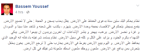 وقال يوسف، اليوم الأحد، عبر حسابه على فيسبوك:” نظام يحكم البلد ستين سنة بدعوى الحفاظ على الأرض، يقتل يعذب يسجن، والحجة حتى لا تضيع الأرض، يقمع يسيطر يتحكم في الاقتصاد بحجة وحدة الأرض.. ينهزم ، يكذب على شعبه و تتاخد مننا سينا و السودان و غزة و نخسر الأرض.. يرهب، يهجر و ينشر الإشاعات أن آخرين يريدون أن يبيعوا الأرض.. يبكي الشهداء يكرم الجنود و يزايد على الكل وكله في سبيل الأرض“.