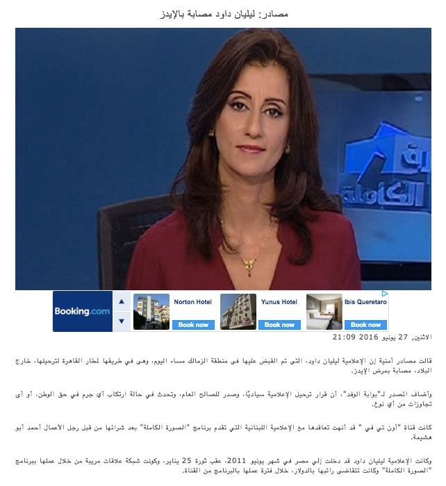 رحّلت السلطات الأمنية، أمس، الإعلامية اللبنانية ليليان داوود من مصر إلي بيروت، بعد إنتهاء تعاقدها مع فضائية ONTV ، دون إبداء أسباب ، وتسابقت الصحف المصرية المحسوبة علي النظام في تبرير أسباب الترحيل، دون أدلة.