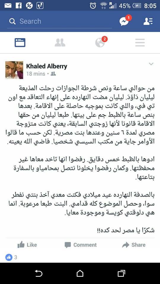 وحتي الآن لم يتم إعلان السبب الحقيقي لترحيلها، إلا أن زوجها الكاتب الصحفي خالد البري، قال عبر الفيس بوك، إن الضباط أبلغوه عند مداهمة منزلها، إن دي أوامر من مكتب السيسي.