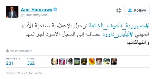 أما الهاشتاج الثاني دشنه النشطاء أمس عقب قرار ترحيلها ويحمل اسم ” #ليليان_داوود” ، شارك فيه العديد من الإعلاميين والسياسيين، معبرين عن غضبهم من القرارات التعسفية للدولة في حق المعارضين.