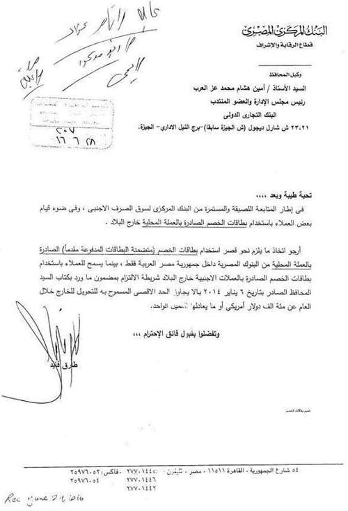 وكانت وسائل إعلام مصرية نشرت، أمس الأربعاء، صورة ضوئية من قرار صادر عن البنك المركزي المصري، يخاطب فيه البنوك المحلية، بالالتزام بقصر استخدام بطاقات الخصم “متضمنة البطاقات المدفوعة مقدما” الصادرة بالعملة المحلية من البنوك المصرية داخل مصر فقط، بينما يسمح للعملاء باستخدام بطاقات الخصم الصادرة بالعملة الأجنبية خارج البلاد شريطة الالتزام بمضمون ما ورد من تعليمات سابقة بتاريخ 6 يناير لعام 2014، بألا يتجاوز الحد الأقصى المسموح به للتحويل خارج البلاد خلال العام عن 100 ألف دولار أو ما يعادلها للعميل الواحد.
