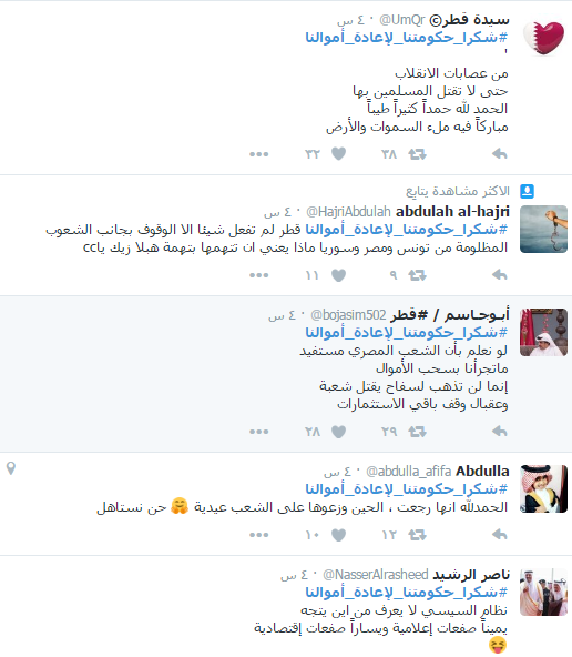 احتفى الرأى العام القطري بسداد البنك المركزي المصري مليار دولار مقابل سندات كانت طرحتها مصر في عهد الرئيس محمد مرسى وقام بتغطيتها بنك قطر الوطني،على موقع التواصل الإجتماعي "تويتر".