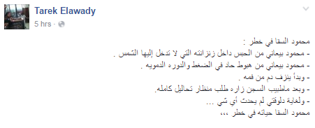وفي ذات السياق، كتب المحامي طارق العوضي على صفحته على “فيس بوك” ، محمود السقا في خطر .. وأضاف محمود بيعاني من الحبس داخل زنزانته التي لا تدخل إليها الشمس وبيعاني من هبوط حاد في الضغط والدوره الدموية، وبدأ ينزف دم من فمه، وبعد ما طبيب السجن زاره طلب منظار تحاليل كامله، ولغاية دلوقتي لم يحدث أي شئ .. محمود السقا حياته في خطر.