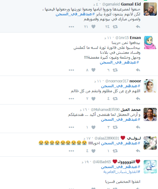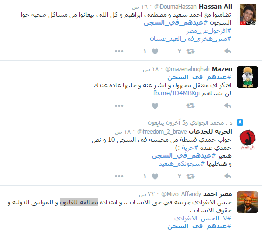 أطلق رواد مواقع التواصل الاجتماعي هاشتاج باسم “عيدهم في السجن”، تنديدًا بحبس الشباب المدافعين عن مصرية جزيرتي تيران وصنافير، وتصدر قائمة الأكثر تداولاً على موقع التواصل الاجتماعي “تويتر” .