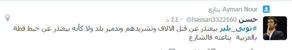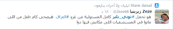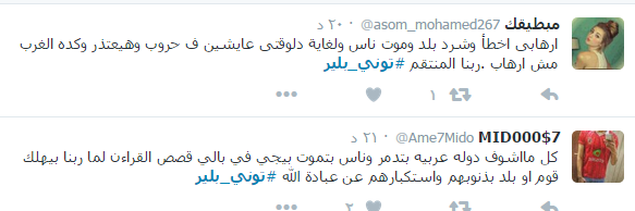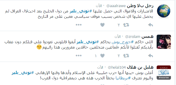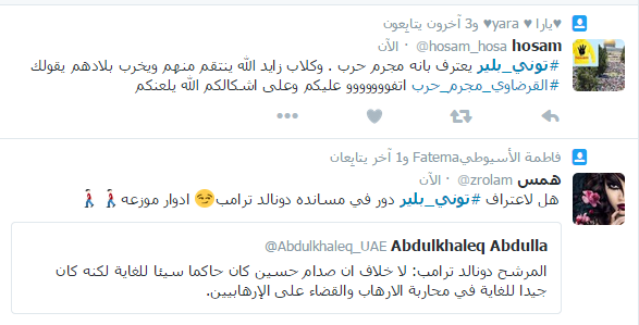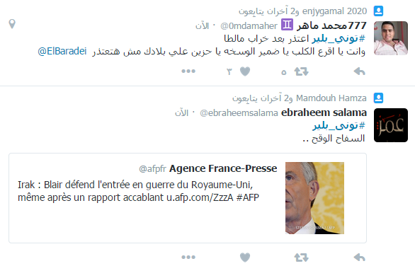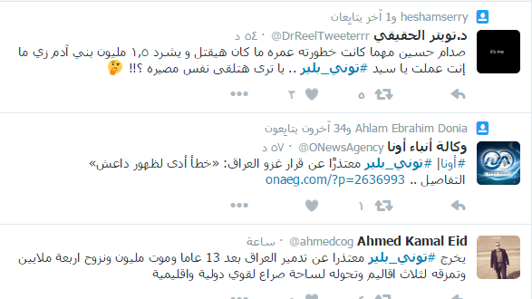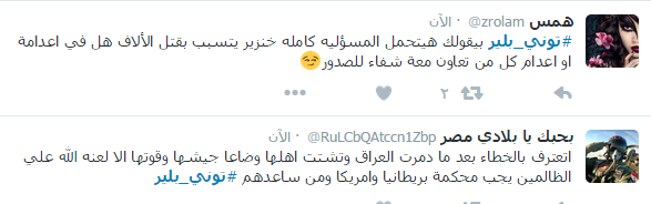 وطالب مغردي “تويتر” بتقديم بلير للمحاكمة العاجلة على أنه مجرم حرب تسبب في تشريد الآلآف من المواطنين، كما أنه تسبب في مقتل الكثير من الجنود البريطانيين في الحرب على العراق.