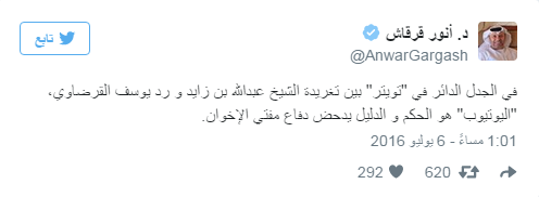 تحولت تغريدة وزير الخارجية الإماراتي، عبدالله بن زايد ، حول اتهامه للشيخ القرضاوي بالتحريض علي العمليات الانتحارية الأخيرة في السعودية ، ورد القرضاوي عليه إلى “معركة” على موقع تويتر، شارك فيها وزراء وأمراء وعلماء دين، واستدعيت فيها فتاوى علماء راحلين مثل الشيخ عبد العزيز بن باز.