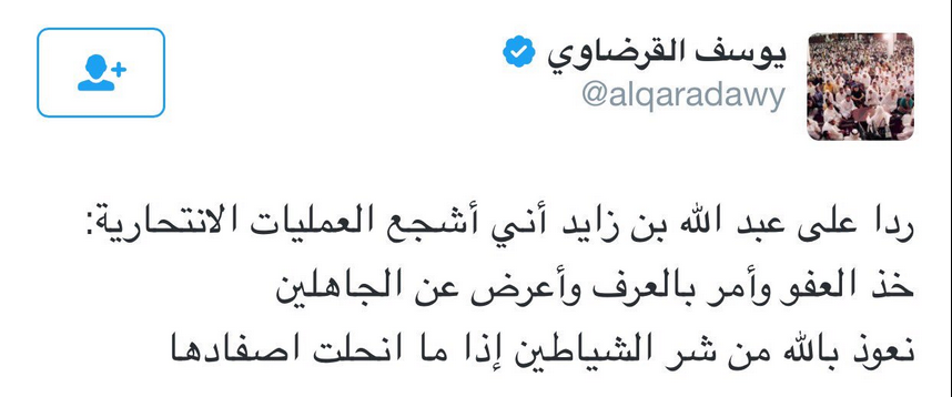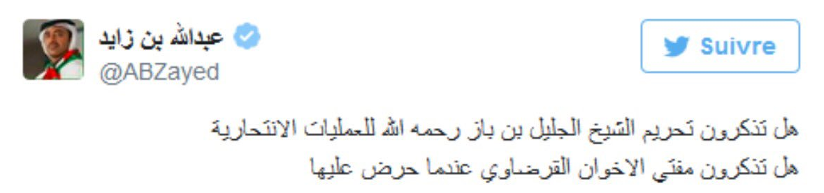 اتهم عبد الله بن زايد ، القرضاوي بالتحريض على العمليات الانتحارية ، في الوقت الذي حرمها رئيس هيئة كبار العلماء في السعودية الراحل عبد العزيز بن باز، بحسب التغريدة.