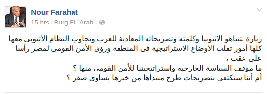وأكد الفقيه الدستوري الدكتور محمد نور فرحات أن زيارة نتنياهو لإثيوبيا وكلمته وتصريحاته المعادية للعرب وتجاوب النظام الأثيوبي معها كلها أمور تقلب الأوضاع الاستراتيجية في المنطقة ورؤى الأمن القومى لمصر رأسًا على عقب”.