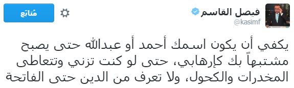 وأضاف القاسم في تغريده له عبر حسابه الرسمي على موقع “تويتر”: “حتى لو كنت تزني وتتعاطى المخدرات والكحول، ولا تعرف من الدين حتى الفاتحة”.