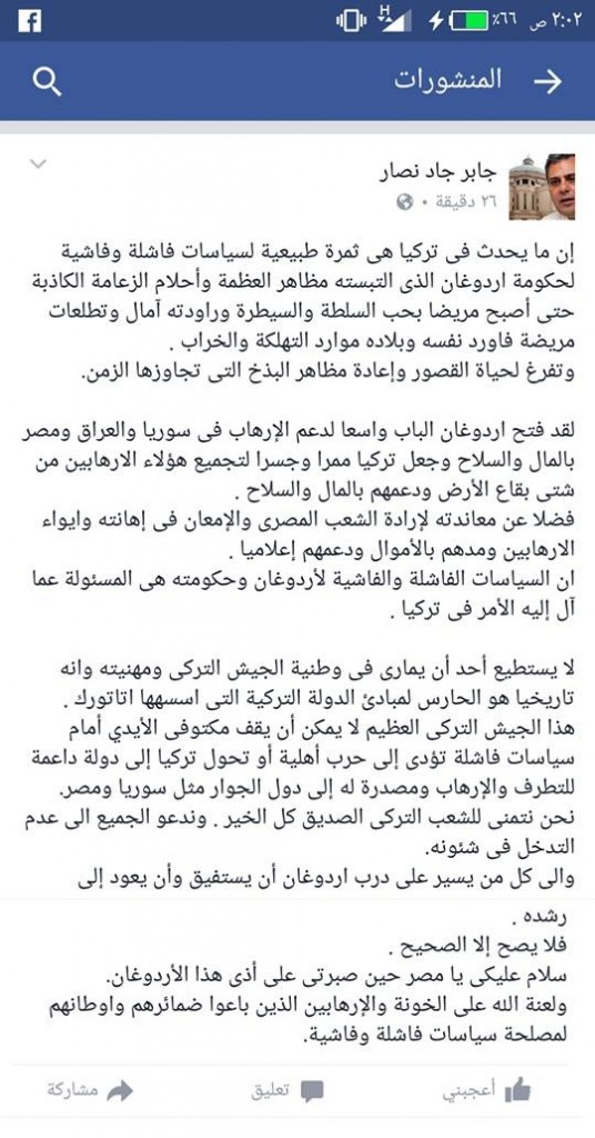 حذف رئيس جامعة القاهرة، جابر نصار، منشورًا له على موقع التواصل الاجتماعي “فيس بوك”، علق فيه على محاولة الانقلاب العسكري على الرئيس التركي رجب طيب أردوغان.
