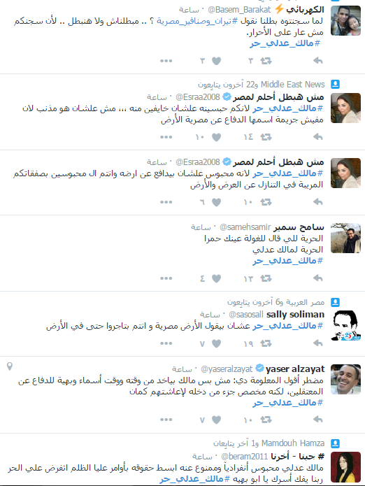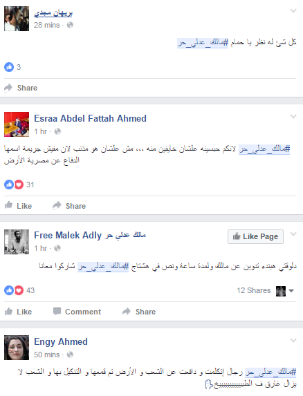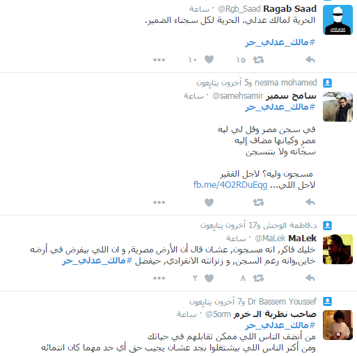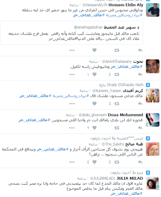 كما تمني بعض رواد مواقع التواصل الإجتماعي الإفراج عن كل معتقلي الرأي، مستاءين من استمرار حبس مالك لاسيما بعد الحكم الصادر بمصرية جزيرتي تيران وصنافير.