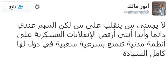 وأضاف مالك في تغريده له عبر حسابه الشخصي على موقع “تويتر”: “لا يهمني من ينقلب على من، لكن المهم عندي دائمًا وأبدًا أنني أرفض الانقلابات العسكرية على أنظمة مدنية تتمتع بشرعية شعبية في دول لها كامل السيادة”.