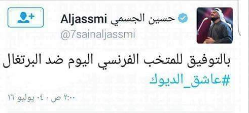 و أطلق الجسمي أغنية “حبيبي برشلوني” لينتهي موسم الفريق الكتالوني حينها بصفر من البطولات، وهبوط حاد بالمستوى، وبعد تغريدته لصالح المنتخب الفرنسي، خسر المباراة أمام البرتغال.