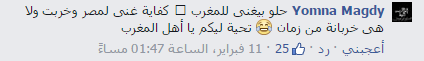 – yomna: “حلو بيغني للمغرب، كفاية غنى لمصر وخربت ولا هي خربانة من زمان، تحية ليكم يا أهل المغرب”.