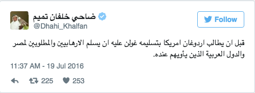 وقال ضاحى فى تغريدات عبر حسابه الرسمى بموقع التدوين المصغر تويتر، “قبل أن يطالب أردوغان أميركا بتسليمه جولن عليه أن يسلم الإرهابيين والمطلوبين لمصر والدول العربية الذين يأويهم عنده”.