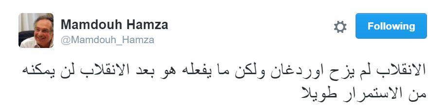 وقال حمزة في تغريدة عبر حسابه الشخصي بموقع التدوين المصغر “تويتر”: “الانقلاب لم يزح أوردغان، ولكن ما يفعله هو بعد الانقلاب لن يمكنه من الاستمرار طويلًا”.