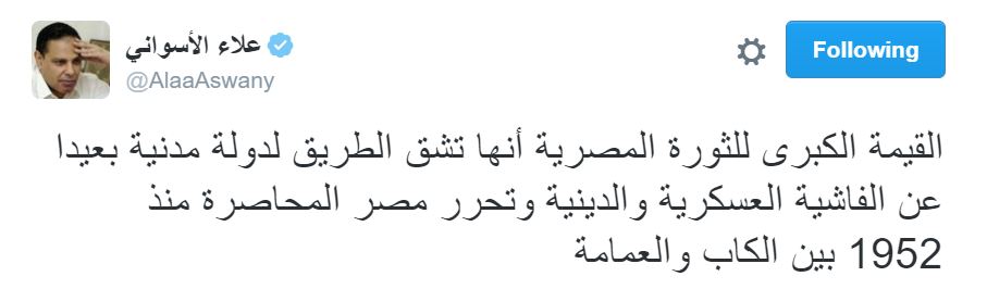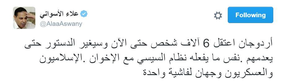 و قال الأسواني في تغريدة عبر حسابه الشخصي بموقع التدوين المصغر “تويتر”: “أردوغان اعتقل 6 آلاف شخص حتى الآن وسيغير الدستور حتى يعدمهم، نفس ما يفعله نظام السيسي مع الإخوان، الإسلاميون والعسكريون وجهان لفاشية واحدة”.